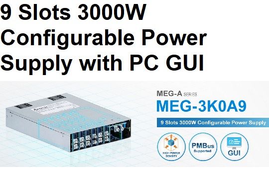 Delta’s newest 3000W output power supply to the MEG-A Configurable Series. The MEG-3K0A9’s power density is up to 27W/inch³ in 7” x 10” x 1.59” package with a total output of 3,000W up to 18 isolated outputs. Each individual output can be configured between 2Vdc – 60Vdc, output current up to 45A with single slot single output module, up to 100A with a triple slot single output module. Features included current sharing, PC GUI for easy parameter setting and monitoring, and intelligent fan speed control. Communication adapter can convert PMBus to USB, RS232 or RS485 interface and also available for 3 input connector options; EU terminal, US terminal and C22.
